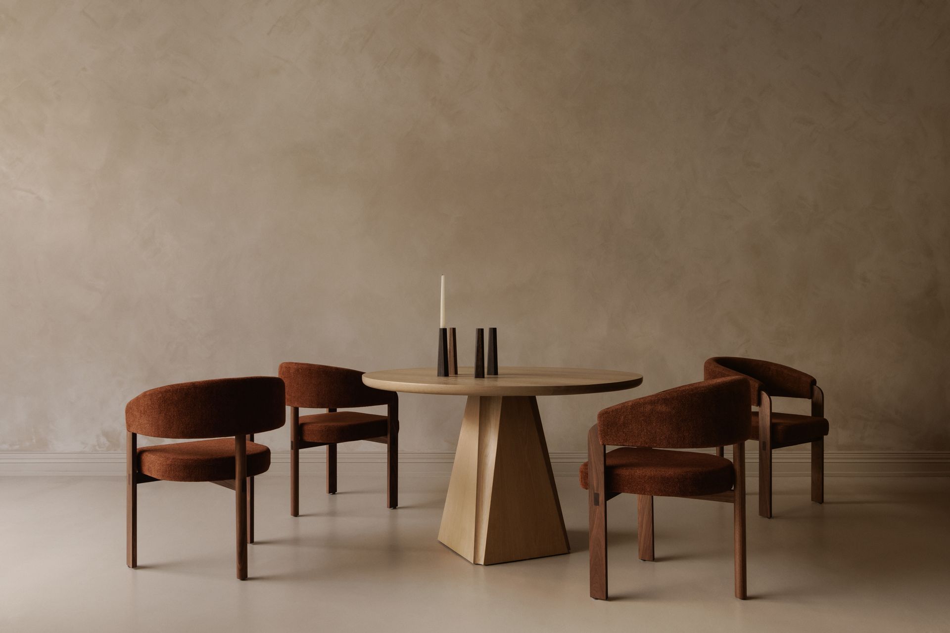 Available in a variety of solid timbers and fabrics. Pictured right – the Hinterland Dining Chair in Walnut and Kvadrat Nara 011.