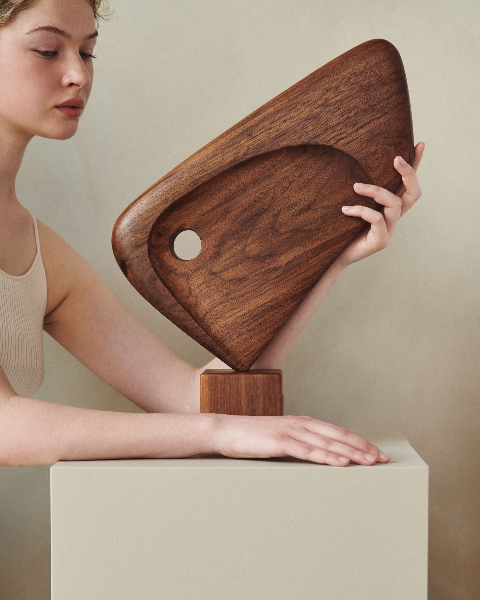 Chandler McLellan crafts highly finished and tactile wood sculptures. His futuristic forms reveal a reverence for ruins and architectural artefacts, emphasising the intrinsic allure of natural materials shaped into expressive designs.