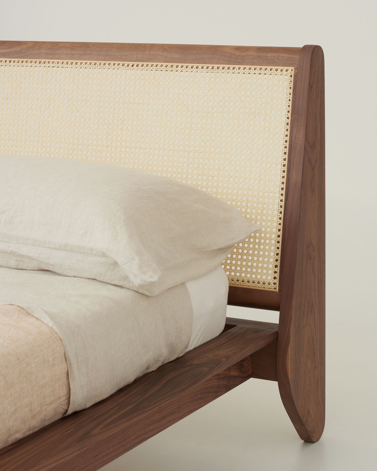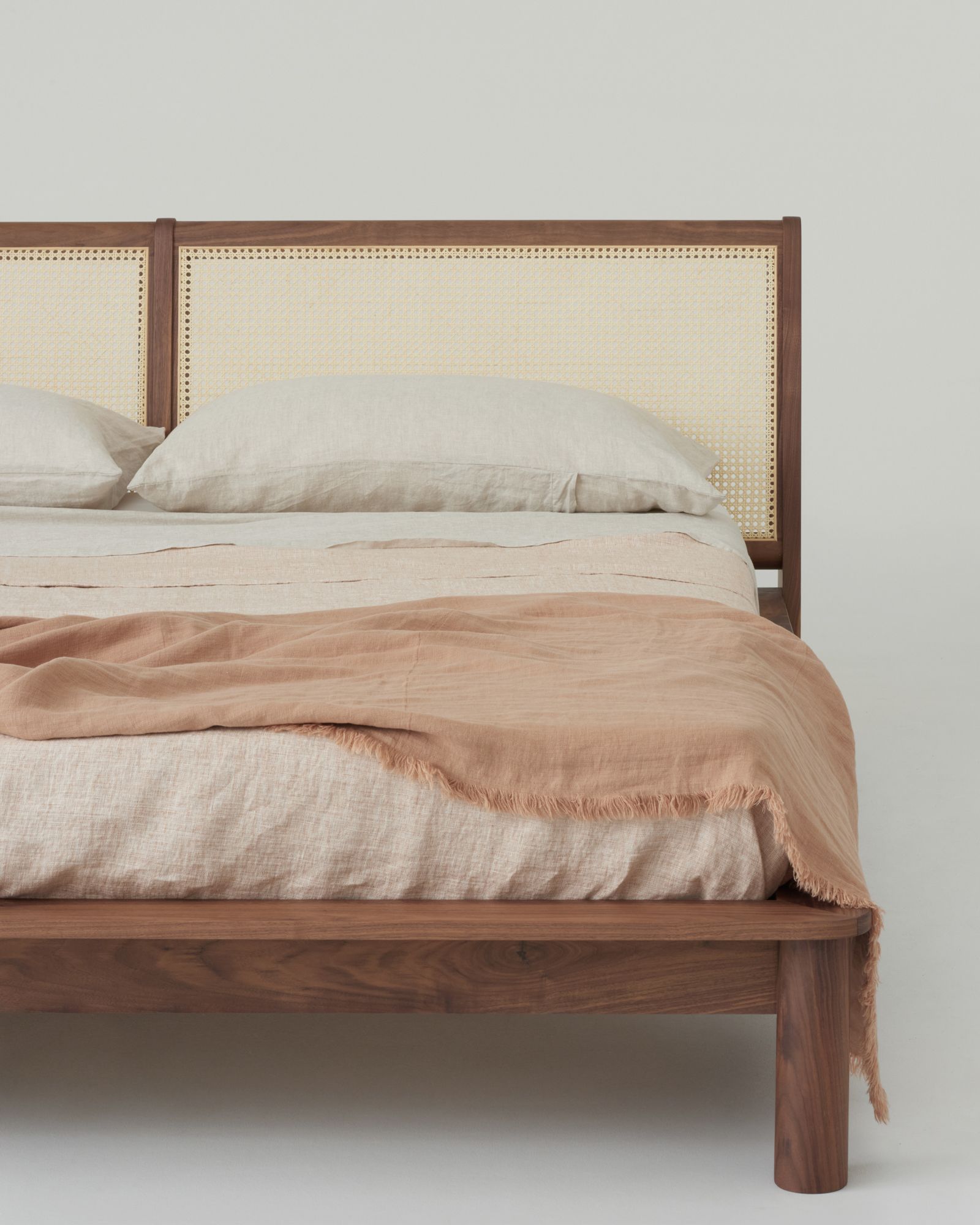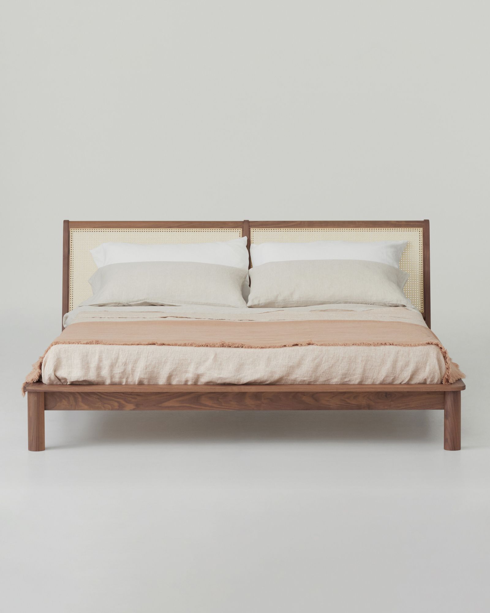 The Booham Bed marries modernist influences with our signature Australian sensibility. The curved base and rounded legs create a sculptural feel, while a rattan or upholstered bedhead adds style and comfort.