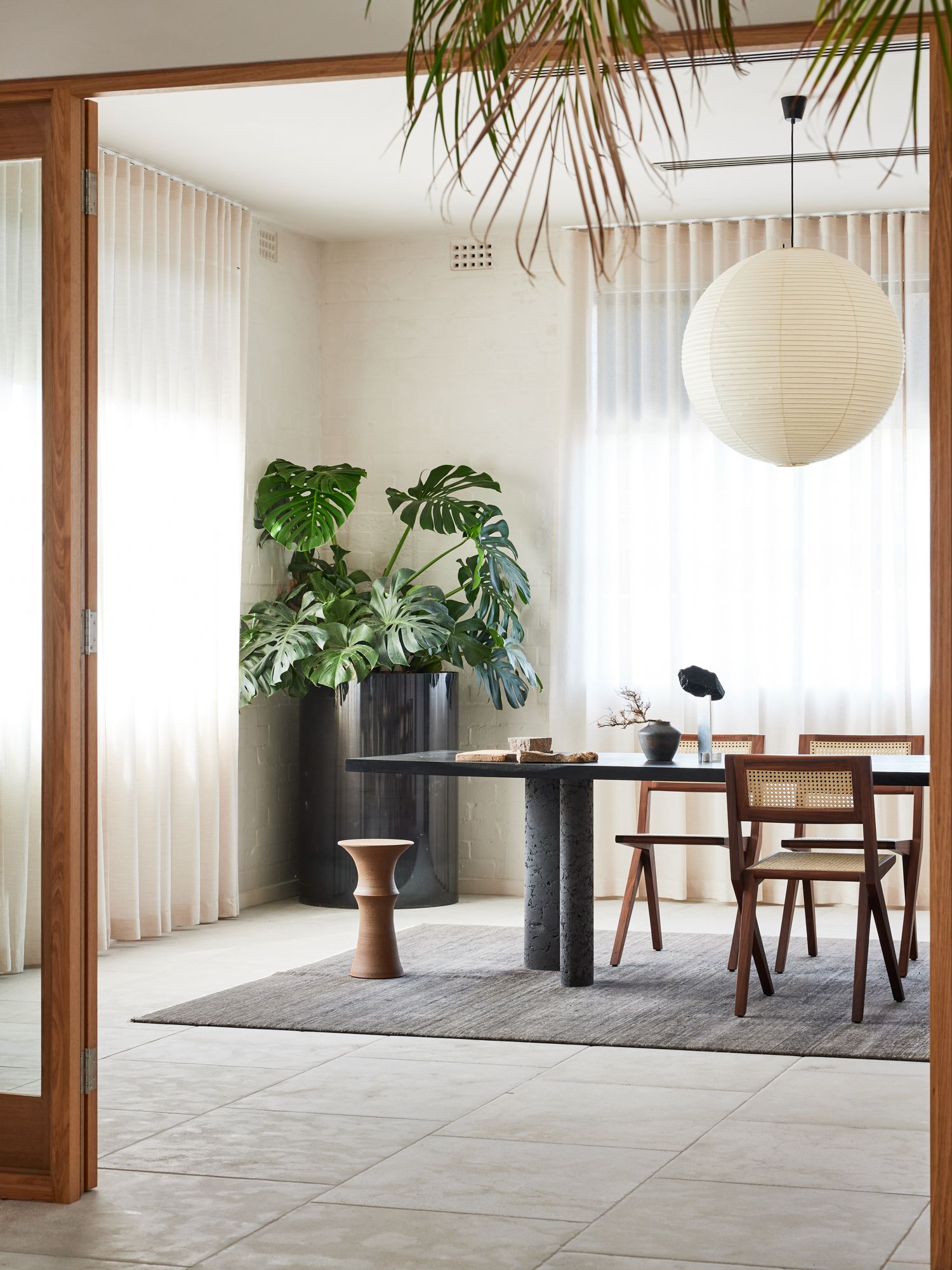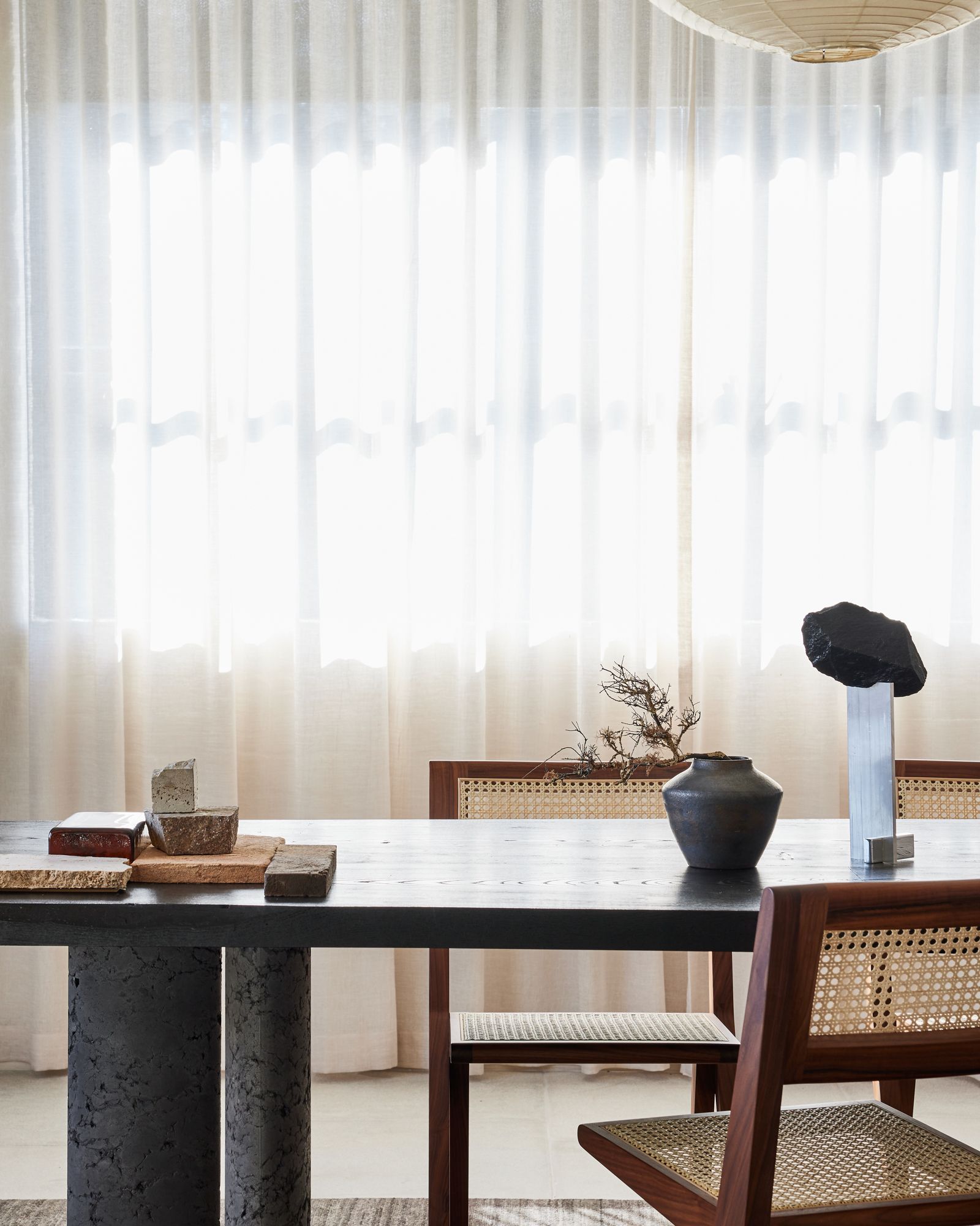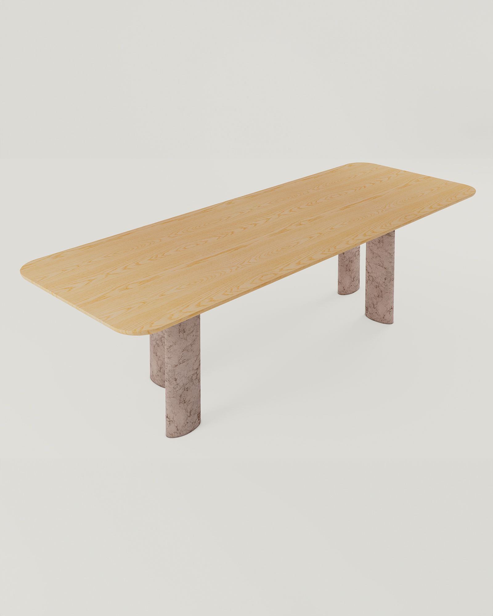 The timber tabletop of the Geo Long Table is anchored to the earth by sedimentary legs symbolising the natural cycle of life, death, and rebirth.