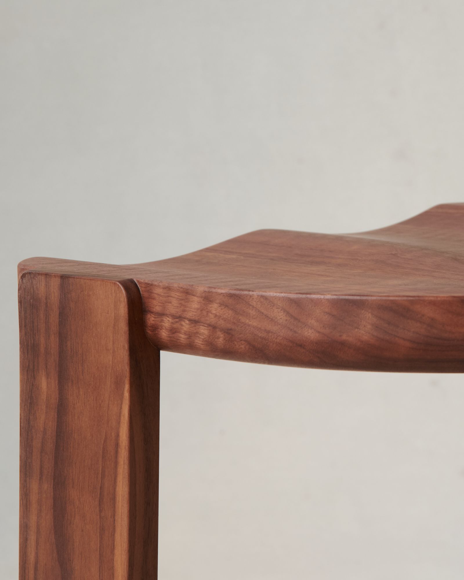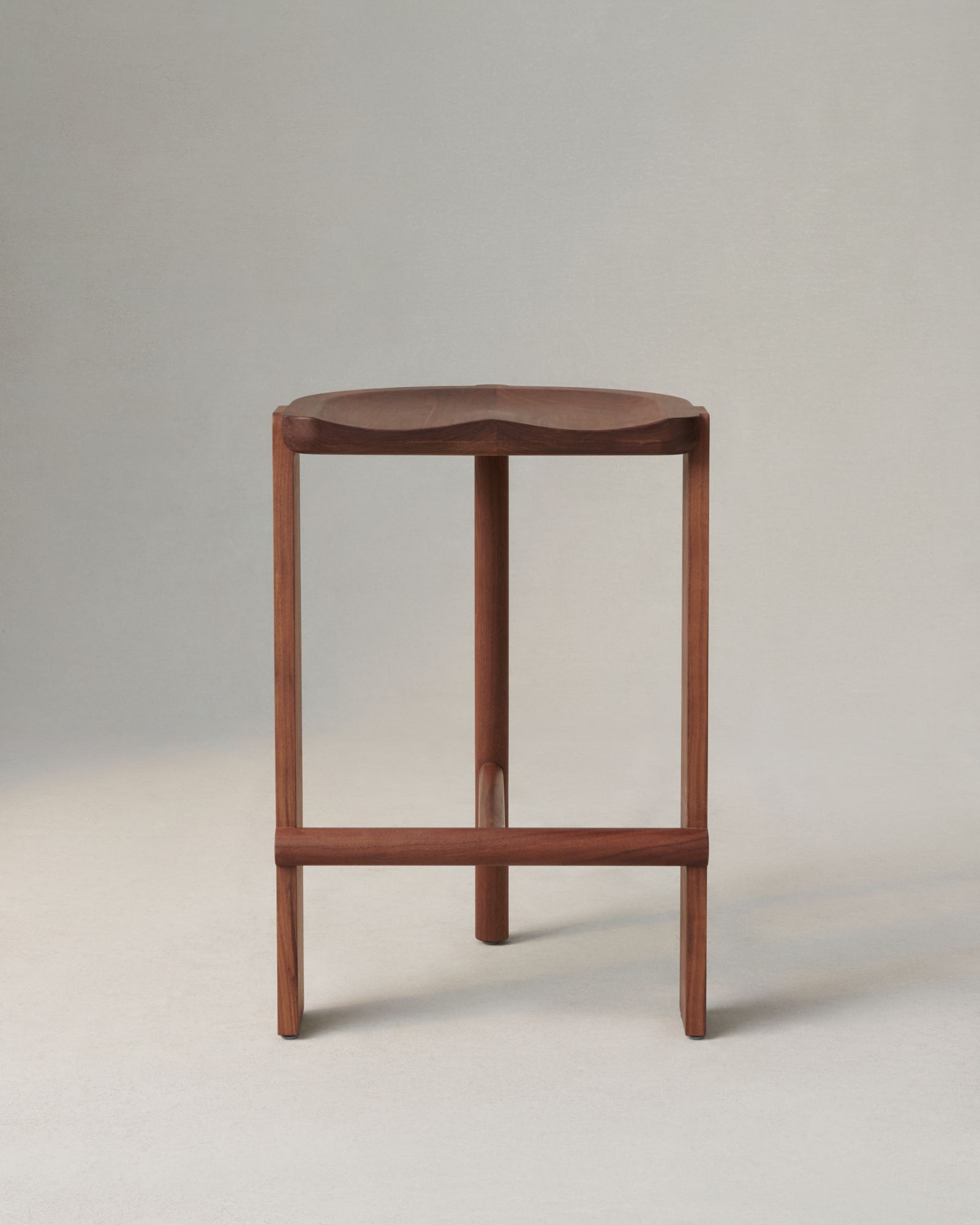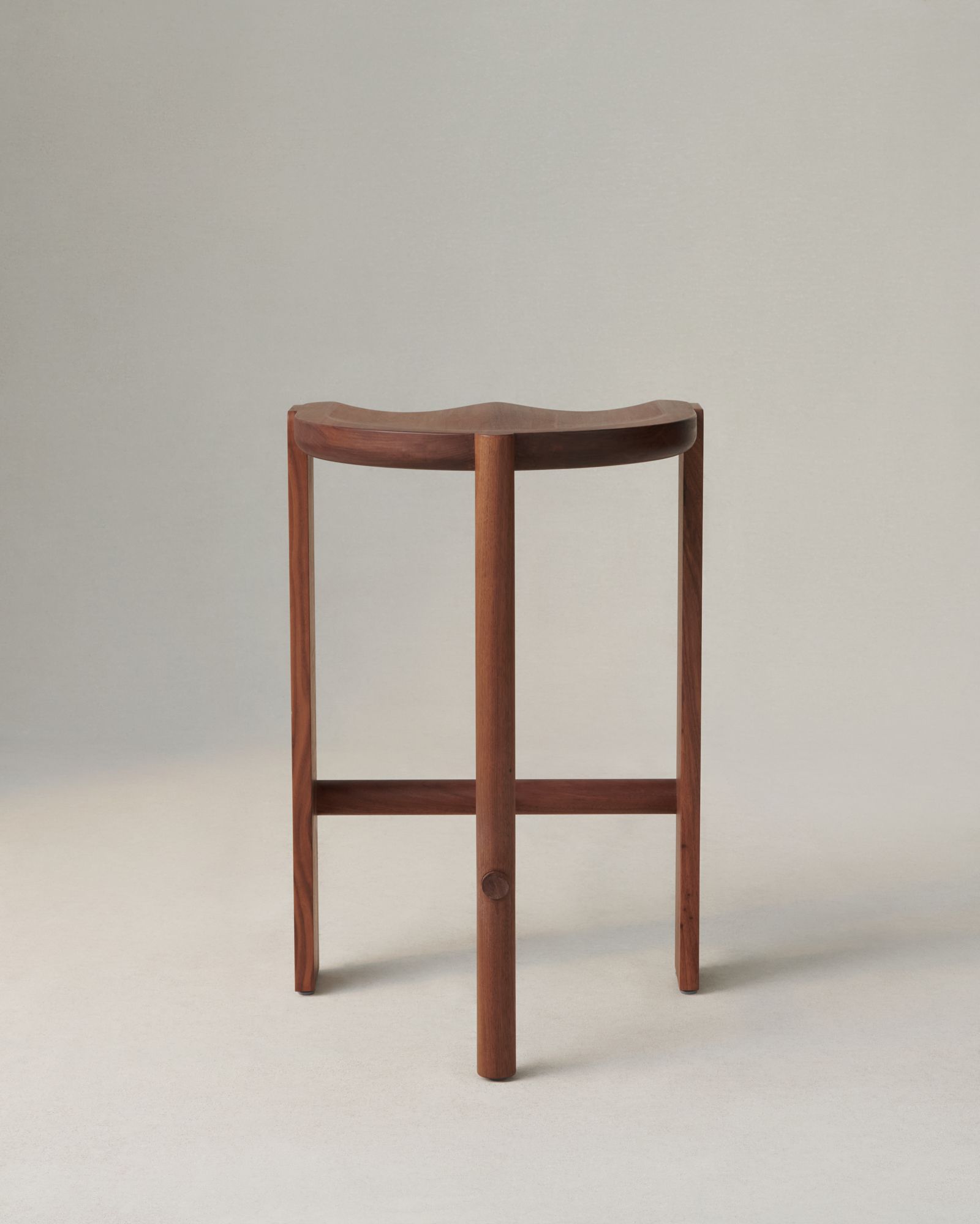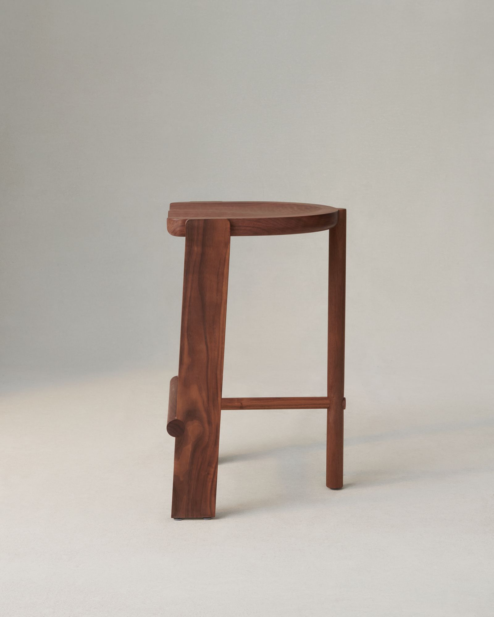 The Hinterland Stool's generously proportioned and sculpted timber seat is supported by an expressed timber framework. Rectilinear front legs are contrasted by a circular, dowel-like rear leg, footrest and brace, creating a playful and jaunty sensibility.