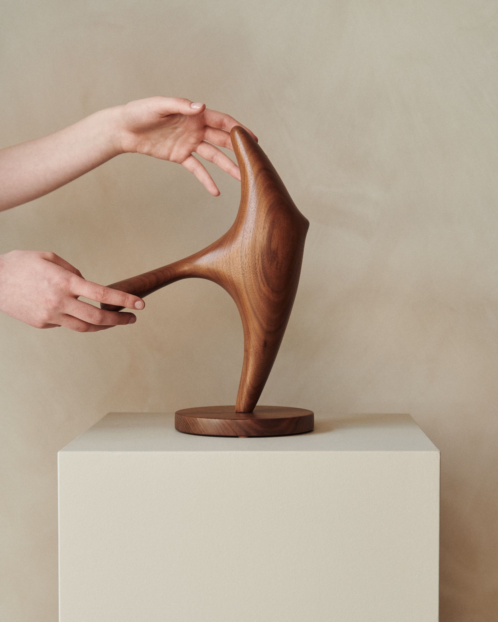 Chandler McLellan crafts highly finished and tactile wood sculptures. His futuristic forms reveal a reverence for ruins and architectural artefacts, emphasising the intrinsic allure of natural materials shaped into expressive and sometimes industrial designs.