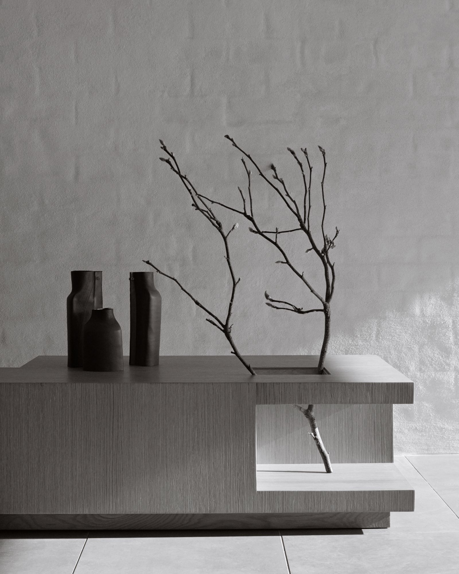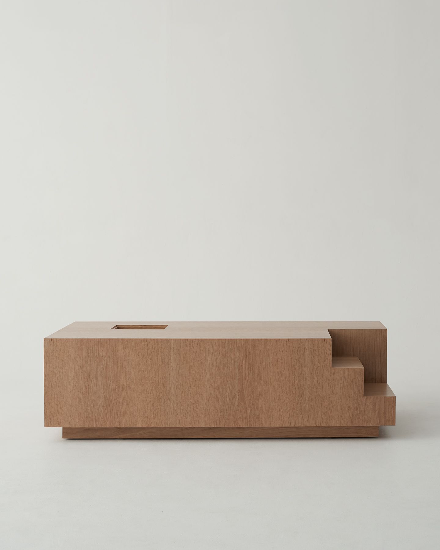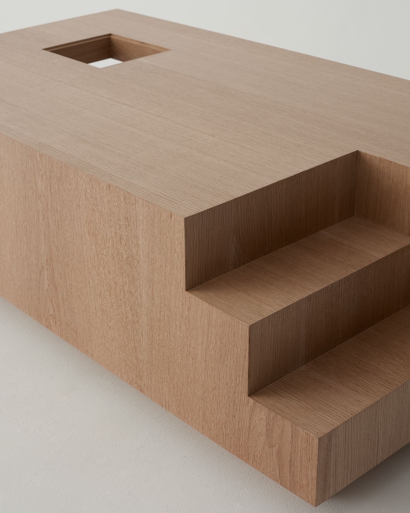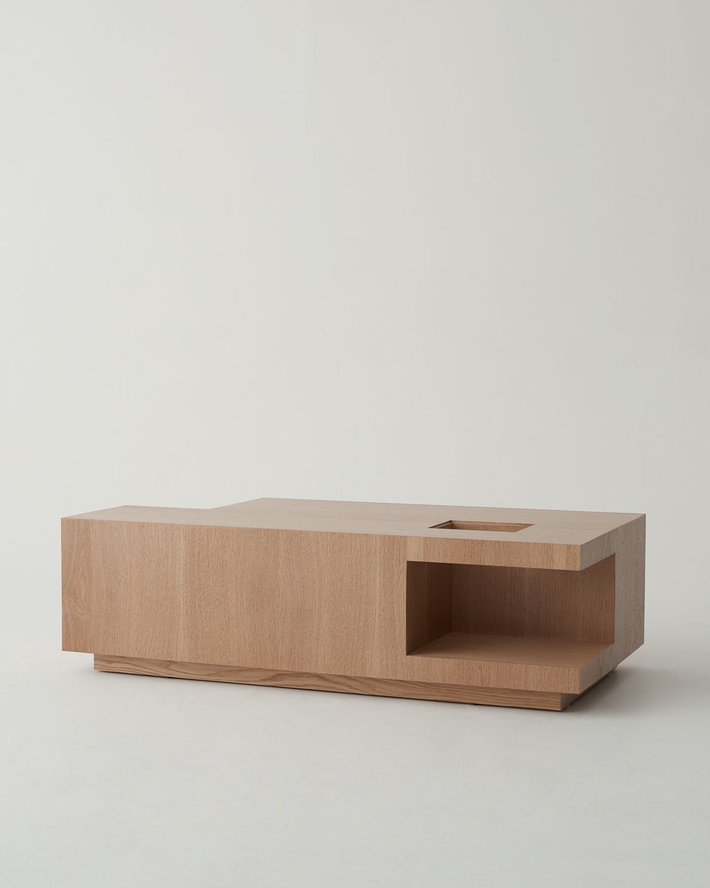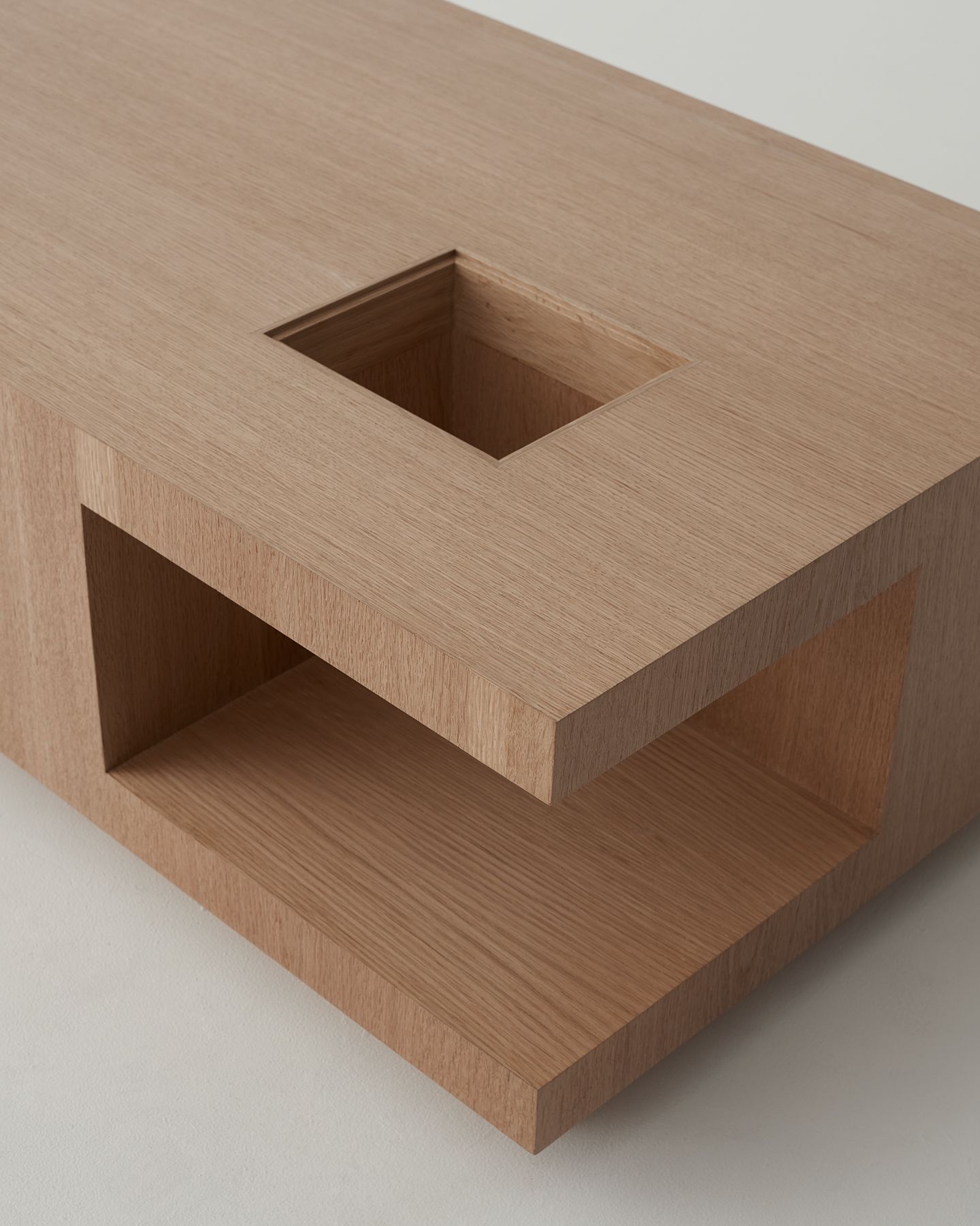 The M-Coffee Table's proportions are determined by the Golden Section and Le Corbusier’s modular man. Conceived as a simple rectangular mass hollowed out at key points, the table is a study in architectural scale.