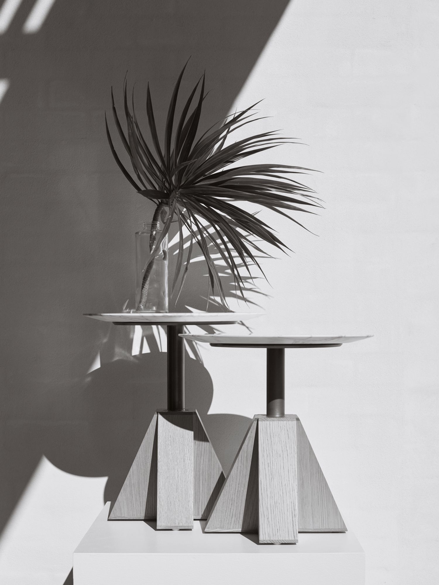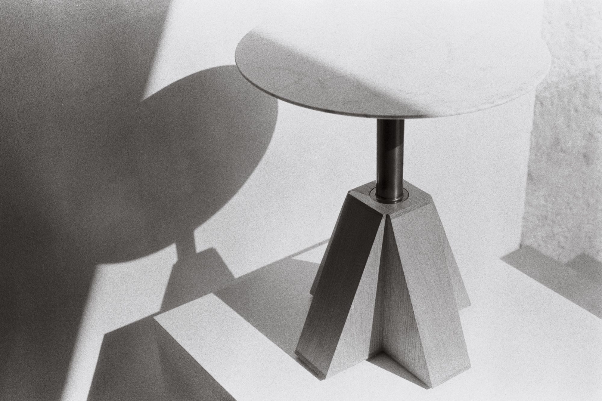 Each part (the base, support and top) are distinct in form and material, in a style that is reminiscent of Constantin Brâncuși's sculptures.