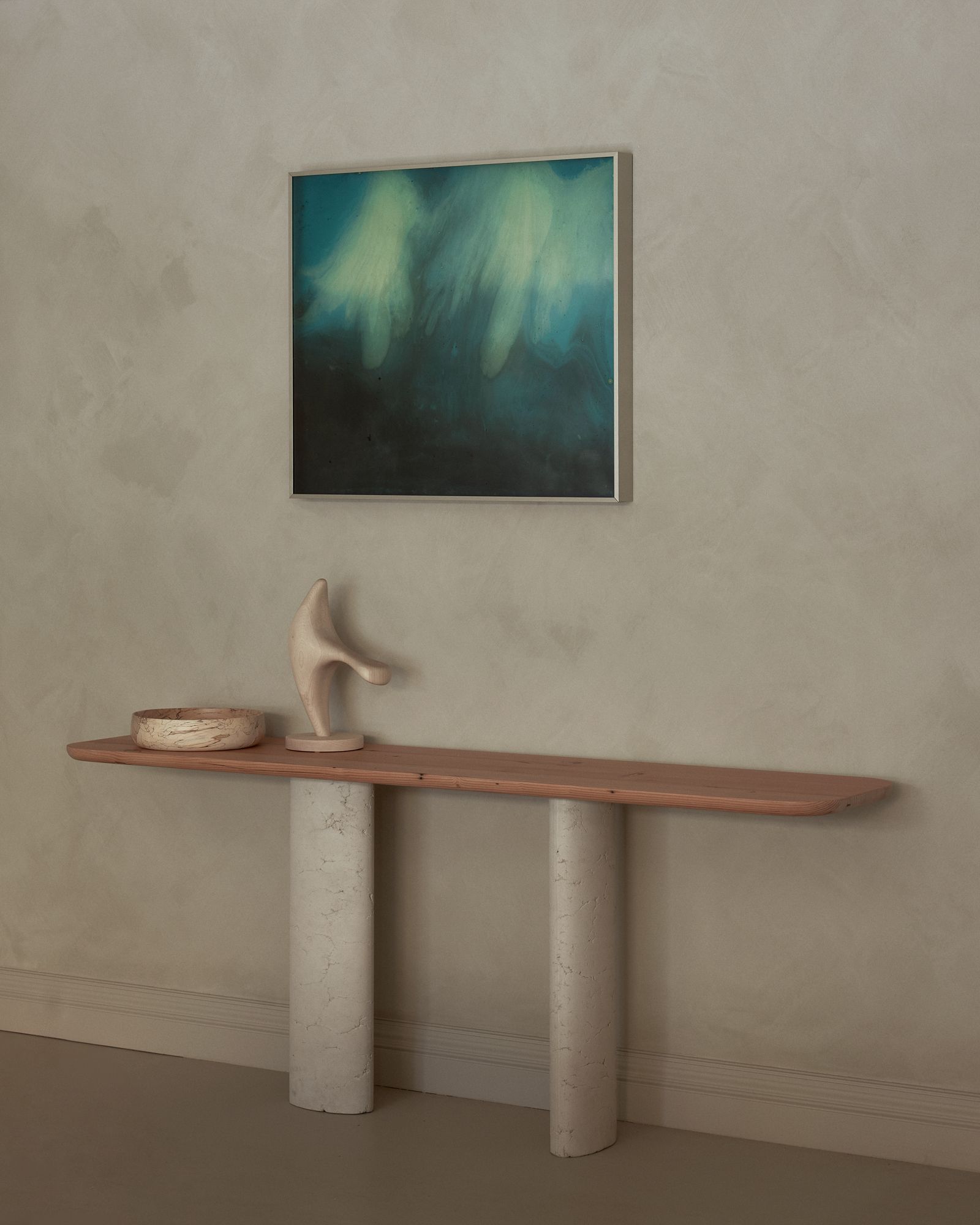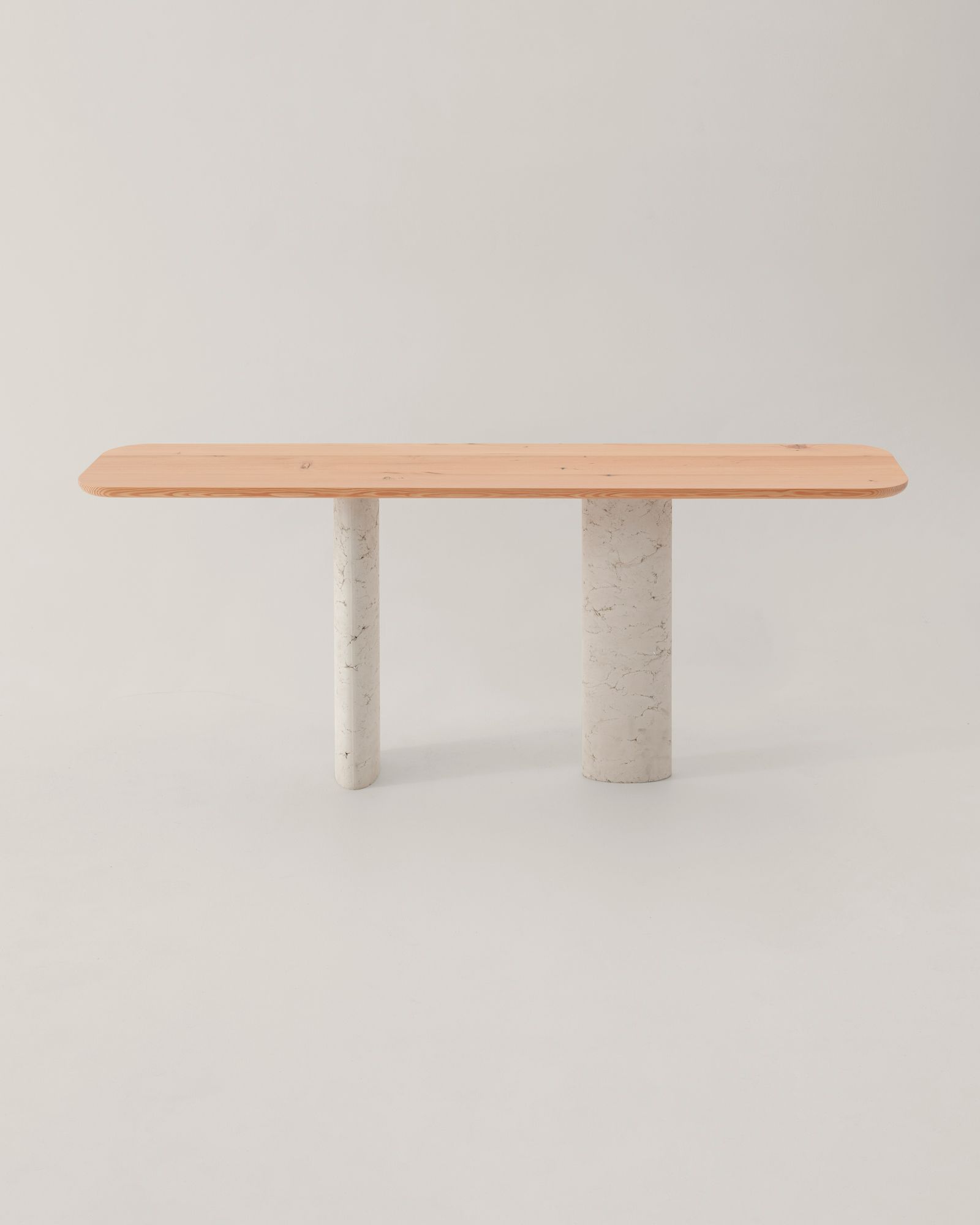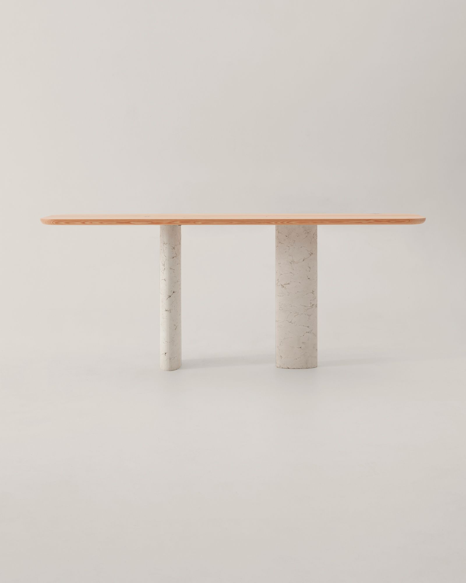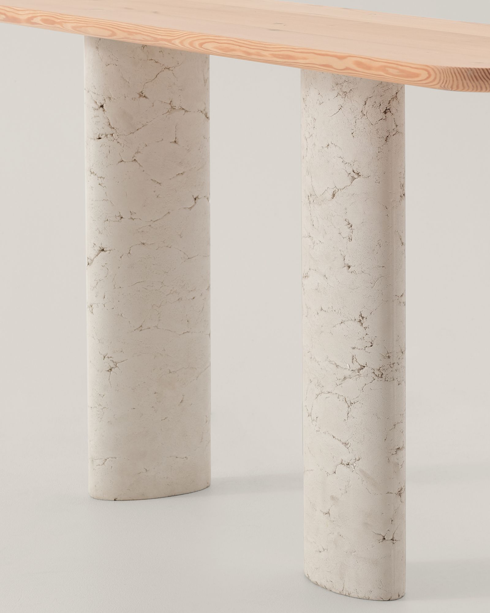 Richly hued and with a distinctive grain, the Oregon top has a soft, pebble-like silhouette with tapered edges – a playful ode to nature’s organic contours. Supported by prototypic concrete legs, upcycled from a previous project, the series celebrates material perpetuity.