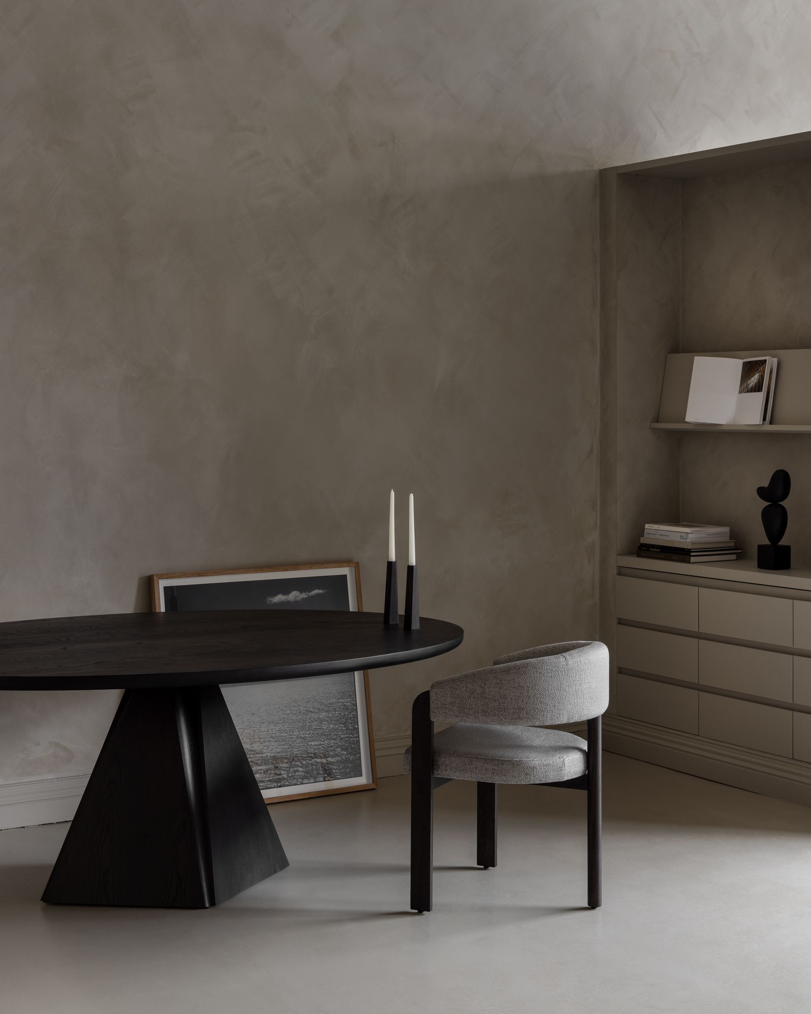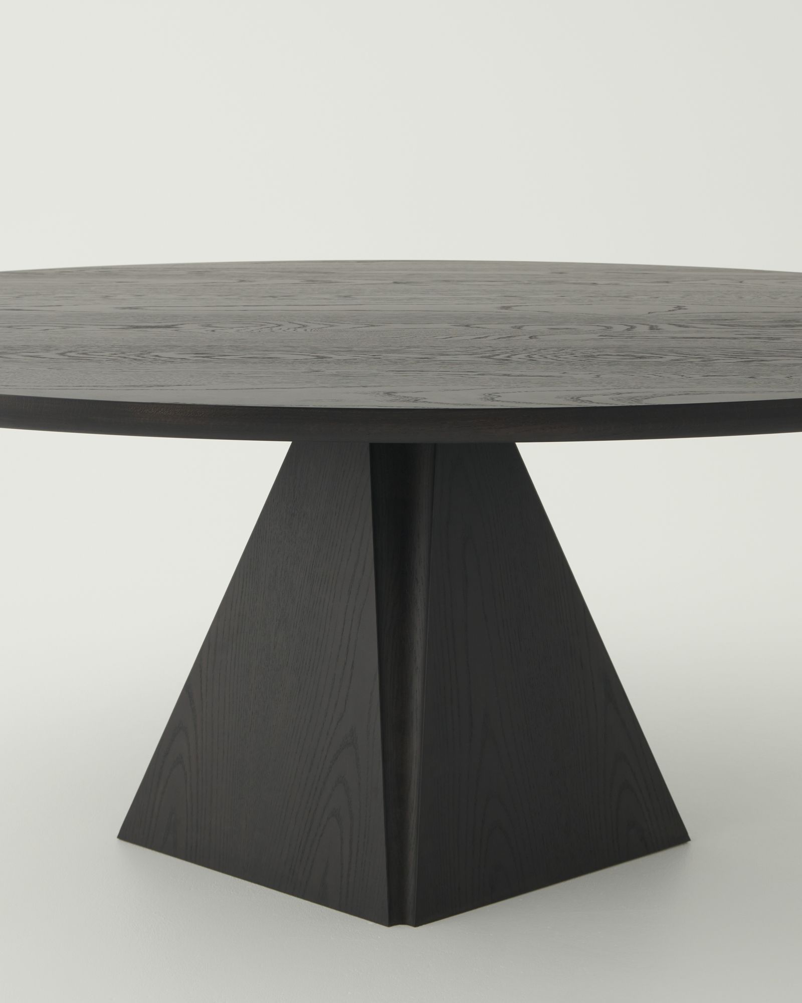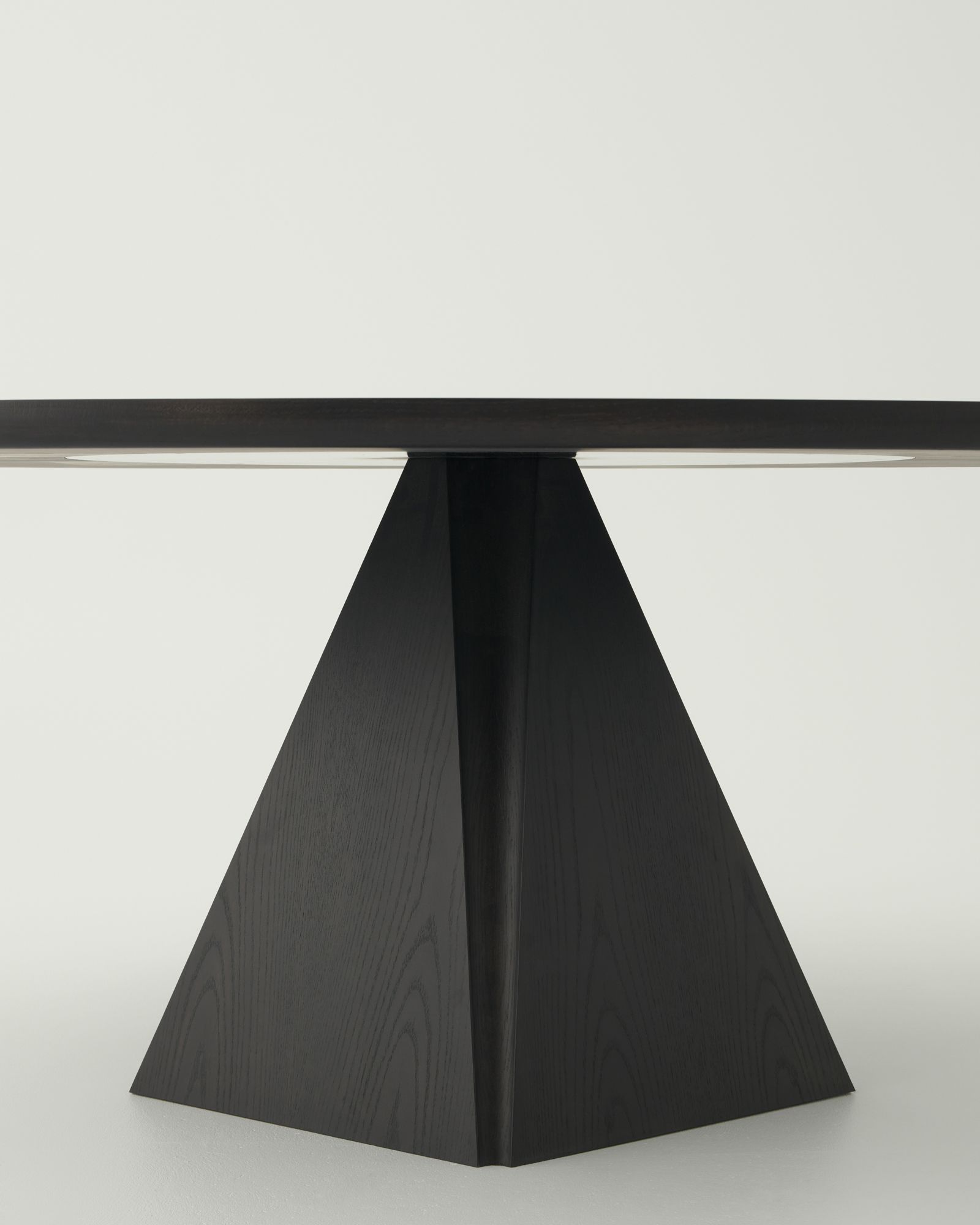 The Prism Oval Table features a pyramidal base with intersecting planes and hollow joints that open up like a seed. This monolithic base supports a curved top for a sculptural and refined dining table.