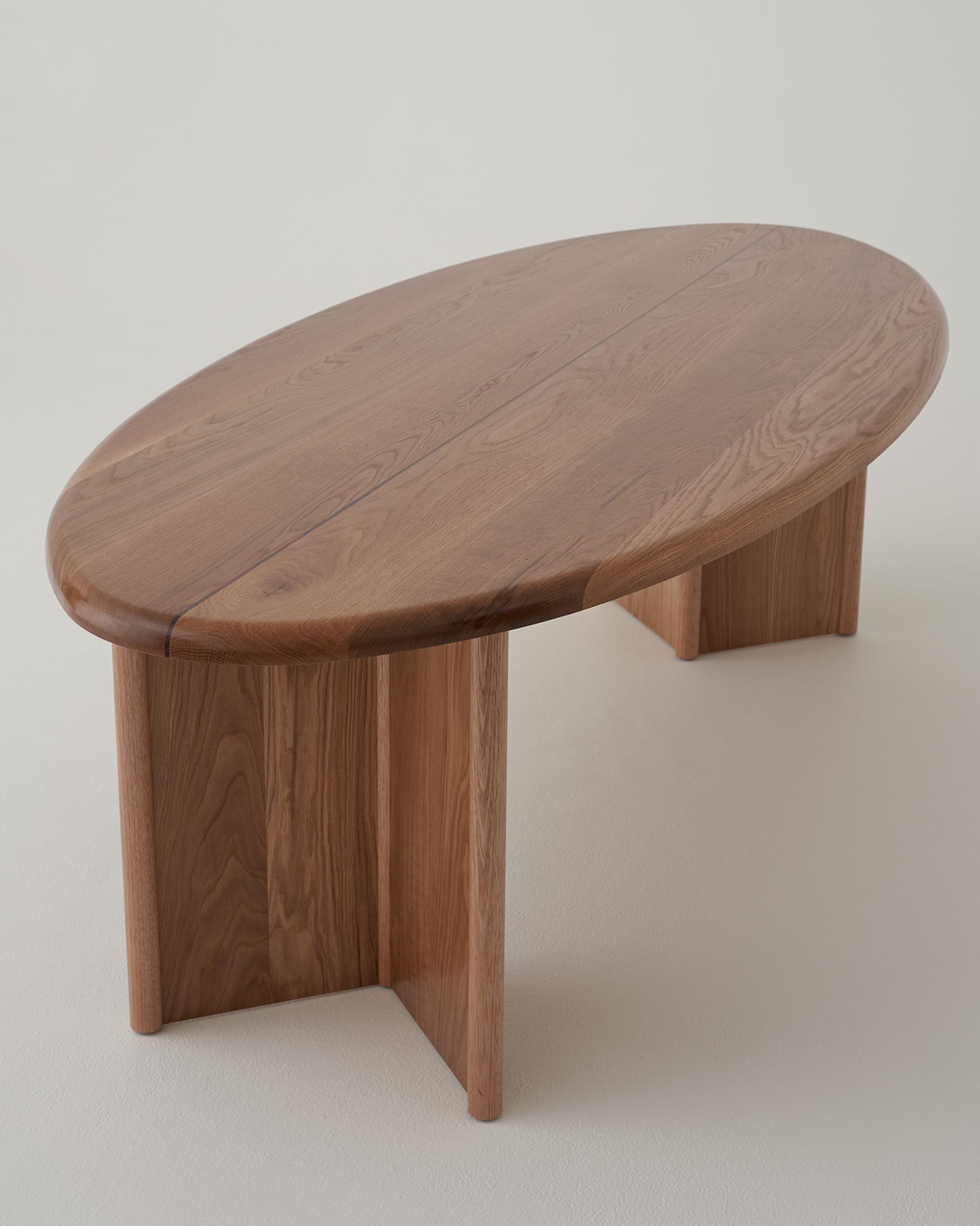 The Surf Dining Table evokes the smooth, curved shape of a classic surfboard.